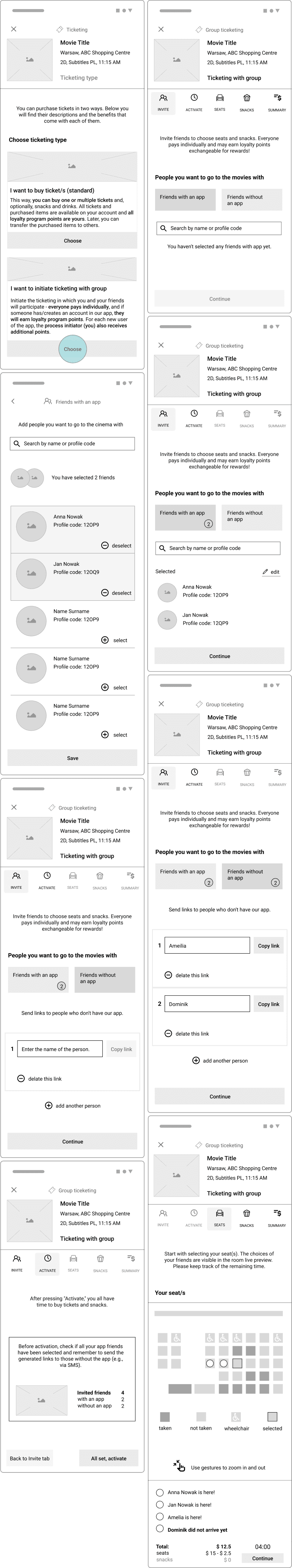 The screen design began with creating low-fidelity wireframes for five main user flows.